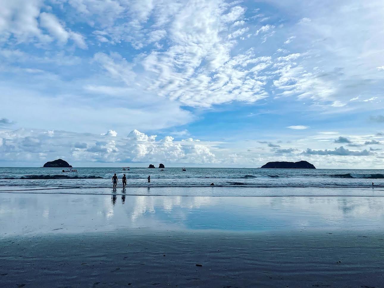Playa Espadilla goes from Puntas Quepos to Puntas Catedral, forming an arch that is divided into 2 parts by an estuary. The rock formation, Roca Tortuga, separates Espadilla Sur Beach from Manuel Antonio Beach. Offerings of: surf lessons, catamaran rentals, banana boats, kite-sailing, vendors pushing fresh coconuts (pipas), teak bowls, snowcones, sunshirts, chicken skewers. Surfing warm waves with body & boogie, sunning, drinking beers & fresh cold coconuts. Piña Coladas from a bus just off the beach. Walked the length of it, through town with its trinkets & bars. Monkeys would swoop down and steal packets of ketchup & mayo.